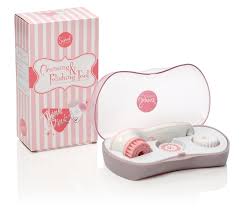 Cada kit contiene una bolsa de maquillaje hermoso, un espejo de maquillaje de diamantes de imitación impresionante, y un lindo kabuki retráctil sintéticos. Precio: $ 49.00
